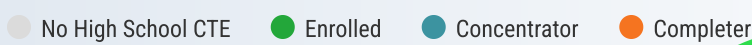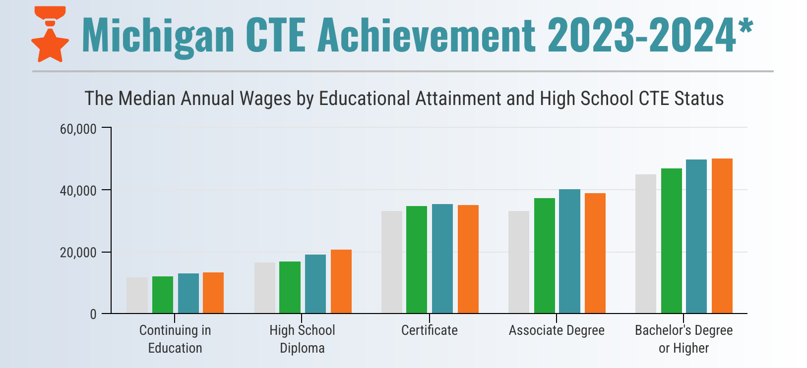 This data compares the wages of 2017-2018 high school graduates from 2023-2024 by CTE achievement levels. The achievement level categories are Continuing Education, High School Diploma, Certificate, Associate Degree, and Bachelors Degree or higher. The data reveals that the wages in each category is higher for those students who are CTE concentrators and completers, based on MiSchoolData.